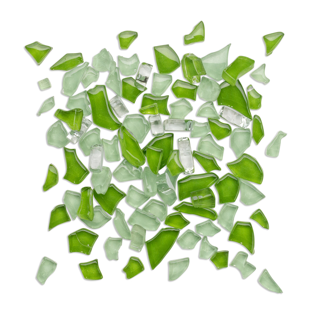 Irregular shaped apple & light green colour backed mosaic glass pieces. Smooth edged with the appearance of smashed glass.
