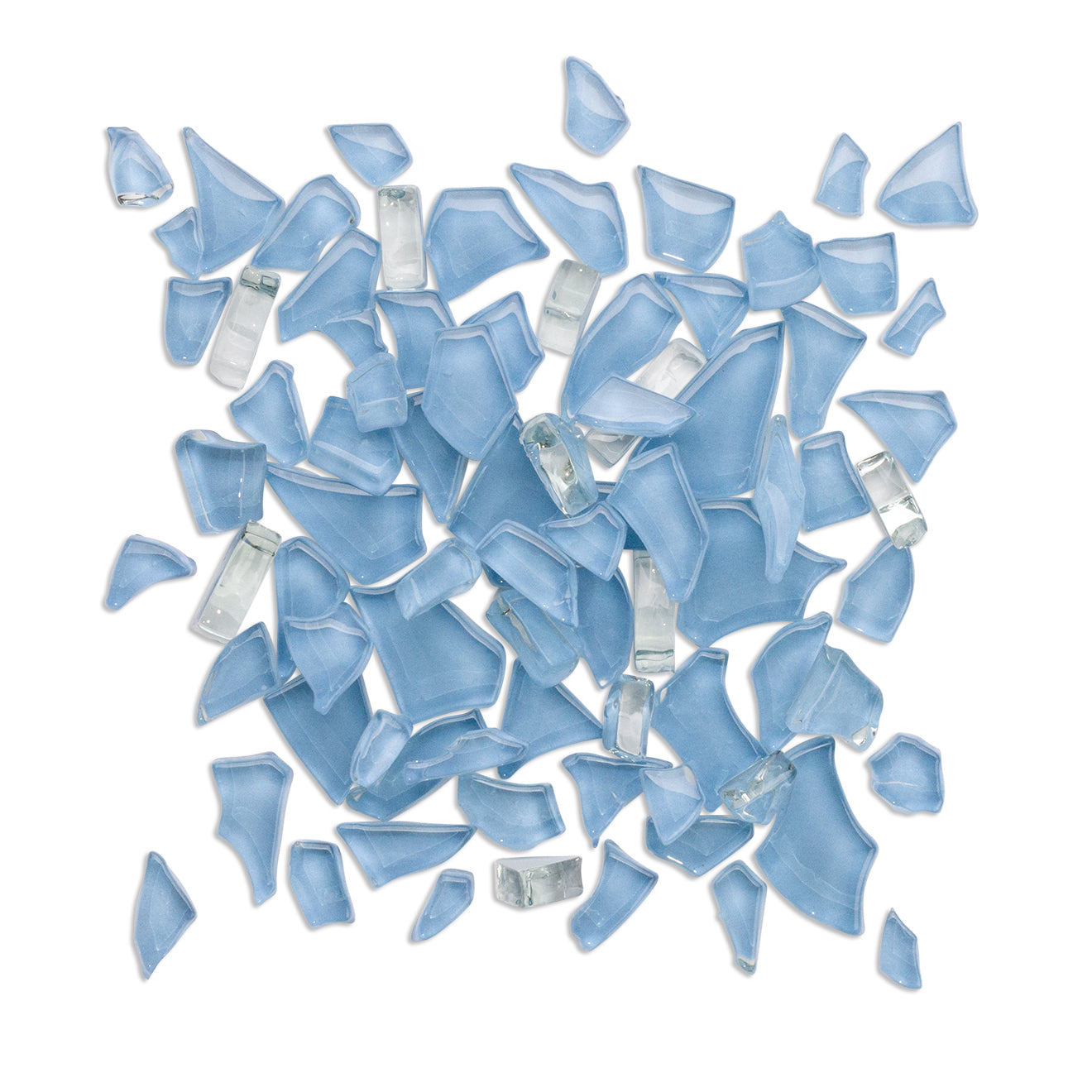 Irregular shaped light blue colour backed mosaic glass pieces.