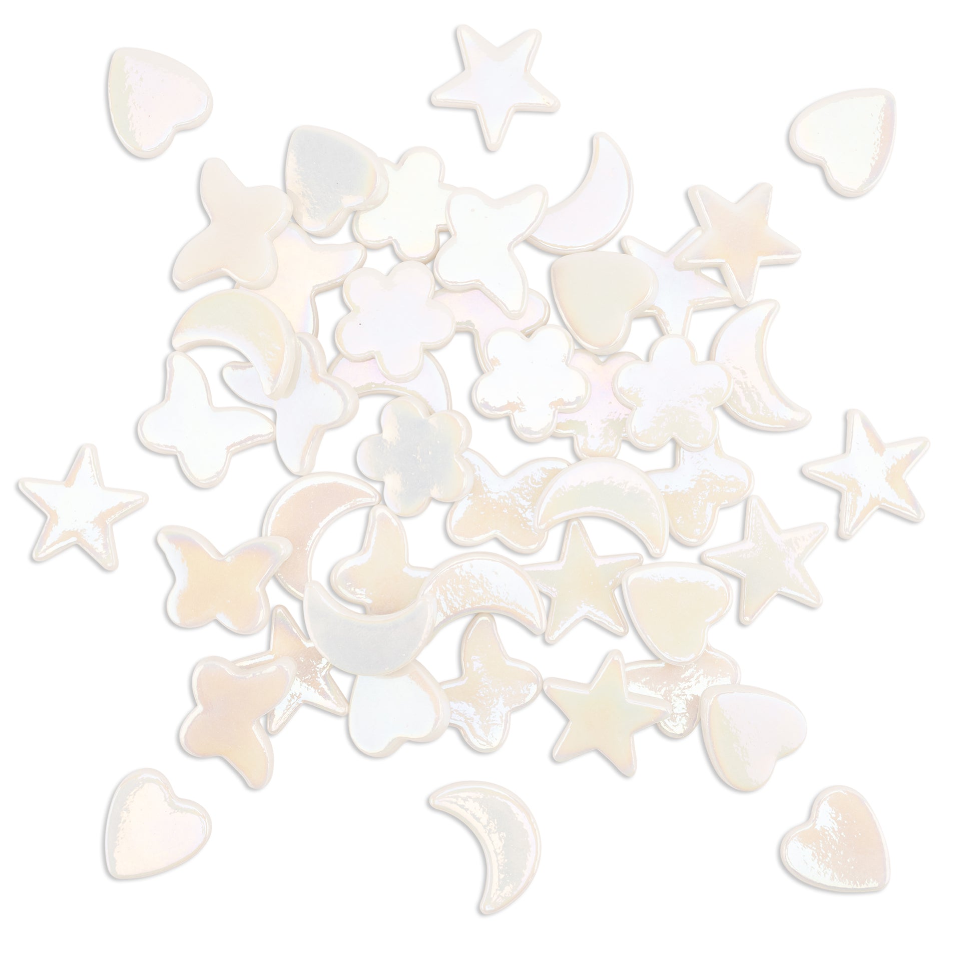 White iridised glass shapes including heart shape, butterfly shape, star shape, moon shape & flower shape.